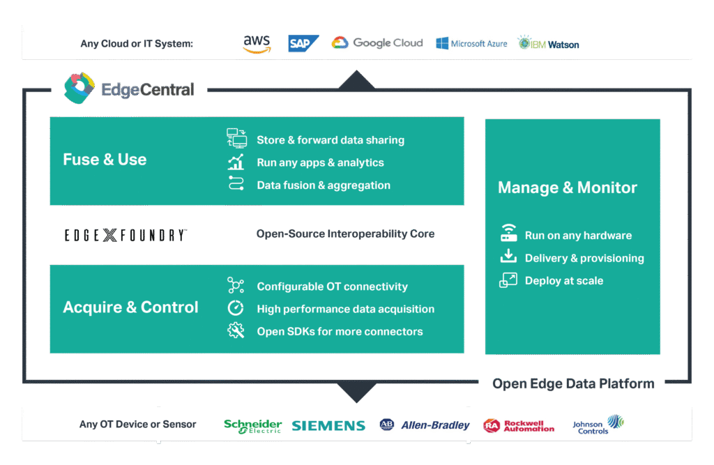 Edge Central aggregates and contextualizes edge data to enable sensor fusion, real-time analytics, and AI-driven decision-making. The platform includes essential data processing services such as scheduling, rules engines, analytics packages, and dashboarding tools.